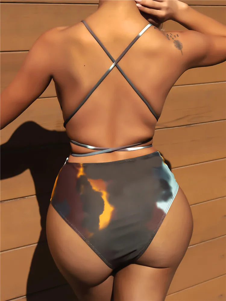 High-cut sides lengthen your legs, sexy cross-straps contour your shape, and the whole piece captures the energy of sunlit waves shifting over the shoreline.